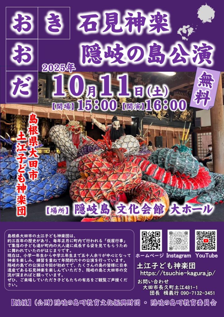 2025.10.6石見神楽を隠岐の島で!! 島根県大田市の土江(つちえ)子ども神楽団24名が来島し...続きを読む