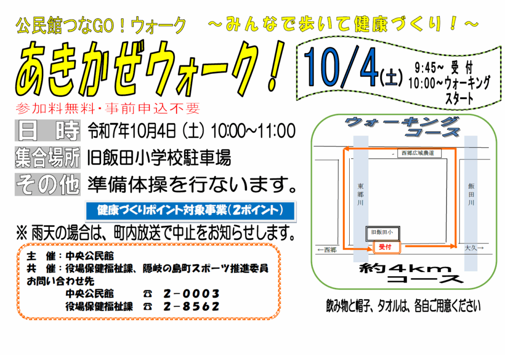 「あきかぜウォーク」(公民館つなGO!ウォーク)の開催について 10/4(土)