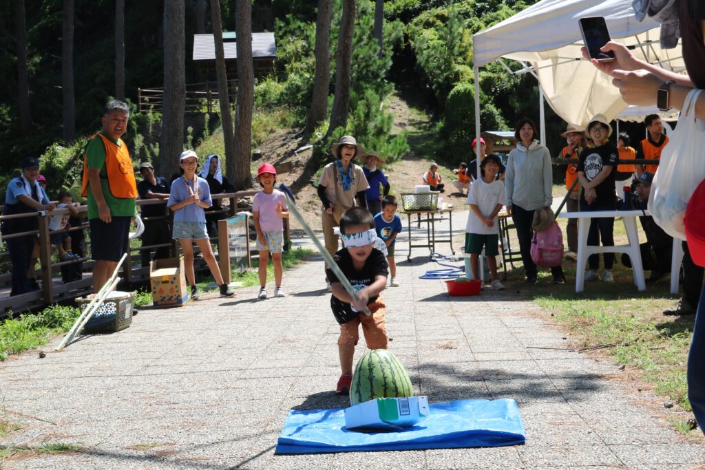 スイカ割りへの参加はお子さん限定!目隠しをして周りの指示に耳を傾け、時に惑わされながら、一生懸命にスイカめがけて棒を振り下ろす様子には皆にっこり。とても和やかで暖かな雰囲気が会場全体を包み込みました。
