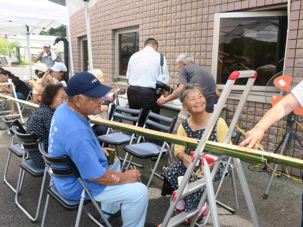 8月26日、都万公民館で高齢者教室「都万笑福館」の皆さんと地元の子どもたちによる夏休み恒例の「流しそうめん」を開催しました。