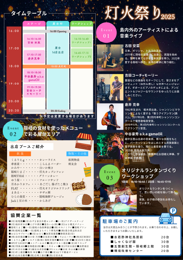 五箇支所地域振興係 閲覧数 19 new灯火祭り2025開催!10/18(土) 2025.10.15 島内 町に賑わいの明かりを灯す「灯火祭り2025」を開催します。 皆さんお誘いあわせのうえ、お越しください。 日時・会場 日時:令和7年10月18日(土) ※雨天の場合翌日に延期 16:00~20:30 会場:水若酢神社 内容 ●隠岐の地元食材を使った屋台 ●島内外のアーティストによる音楽ライブ ●大人から子どもまで楽しめるオリジナルランタンづくりワークショップ開催 主催・お問合せ先 主催:灯火祭り実行委員会 お問い合せ先:080-4448-4920(岩井) コメントを残す コメントをキャンセルコメントを投稿するにはログインしてください。