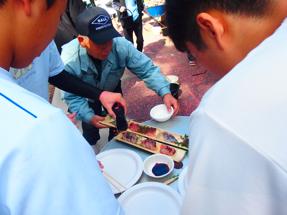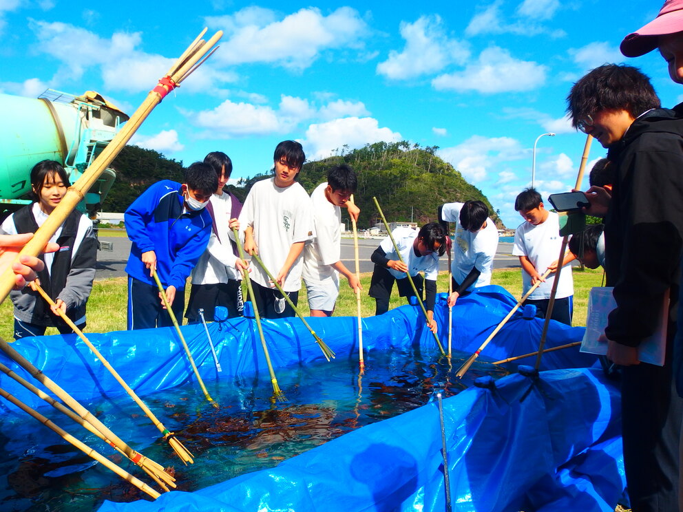 生徒たちは、海辺の生け簀に放たれたサザエやタコを獲る体験にも挑戦しました。はじめはおそるおそるヤス(サザエを獲る道具)を伸ばしていた生徒も、コツをつかむと笑顔いっぱい。生きた海産物をそのまま網の上で焼き、それを味わう姿は、見ている私たちにも元気を分けてくれるようでした。