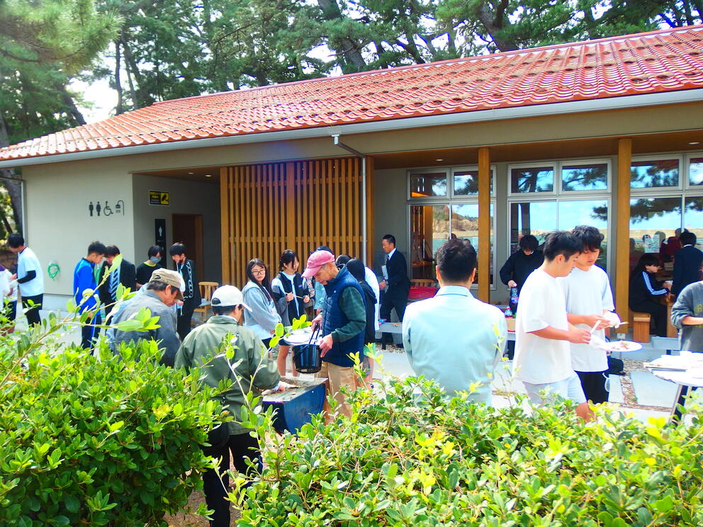 顕彰碑での集いを終えた十津川高校の生徒たちは、昼食会場である「さざえ村」へと移動しました。中村の海を目の前にした開放的な場所で、海の幸やお肉をふんだんに使った豪華なバーベキューが準備されています。