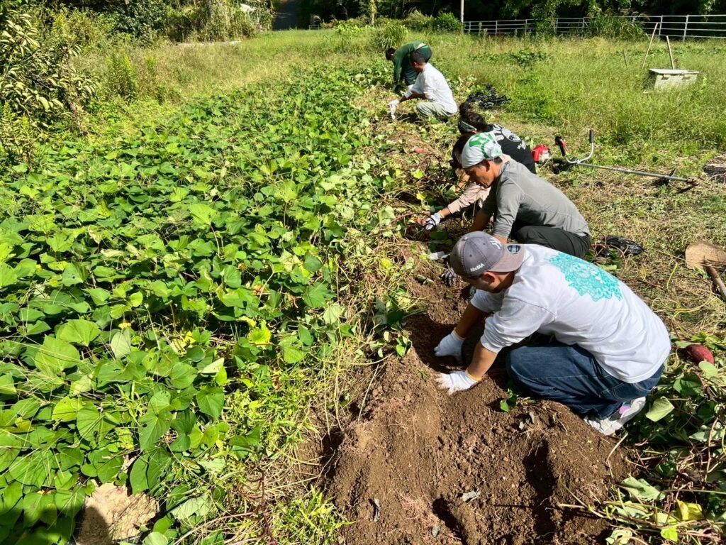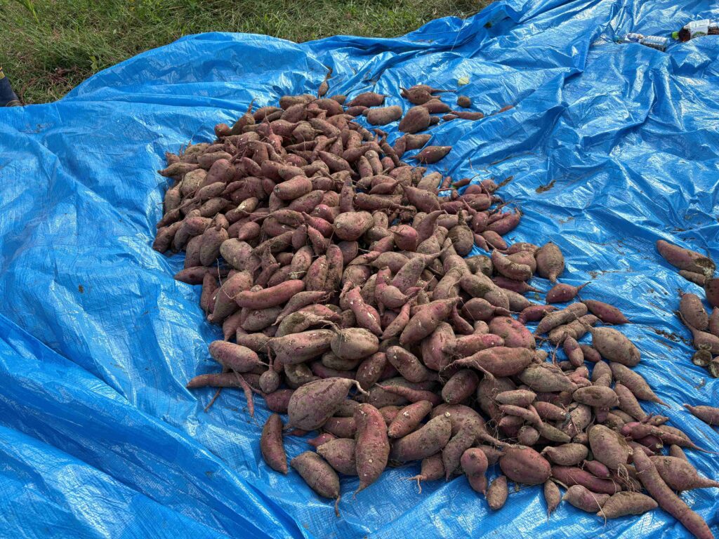 こんにちは!地域おこし協力隊です。 先日サツマイモの収穫を行いました。苗植えを行ったときはとても小さかったのですが、収穫当日にはたくさんのツルを伸ばして大きくなった姿に感動しました。ここまで大切にお世話をしてくださった協力隊の瀧川さん本当にありがとうございます! いざ収穫を始めてみると、思っていた以上にたくさんのサツマイモが出てきてびっくり。芋が埋まっている周辺を軽く掘り起こしてからツルを引っ張ると、土の中からゴロゴロと芋が顔を出します。 ただし、途中でツルが切れてしまうこともあり、その時は手で慎重に掘り起こしていきます。サツマイモはとても繊細で、少しの力加減で傷ついたり、折れたりしてしまうので丁寧さが大切。 当日は協力隊メンバーのお子さんも手伝いに来てくれました。一生懸命に芋を掘る姿が本当にかわいらしくて、見ているだけで癒されました。自分で掘った芋を誇らしそうに見せてくれる姿にも、みんなが自然と笑顔に。 今回収穫した量は約100キロ! このサツマイモたちは今後町内の企業で加工・販売される予定です。どんな商品になるのかはまだお楽しみですが、どんな形で広がっていくのか今からとても楽しみです。