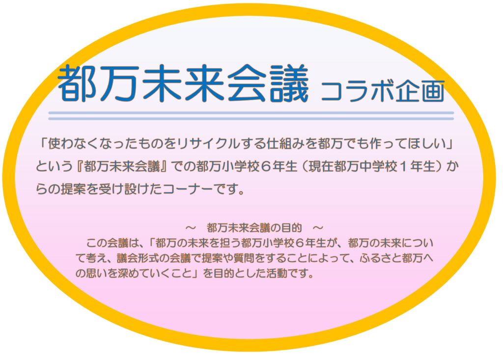 この取り組みは、「使わなくなったものをリサイクルする仕組みを都万でも作ってほしい」という『都万未来会議』での都万小学校6年生(現在都万中学校1年生)からの提案を受け設置したコーナーです。
