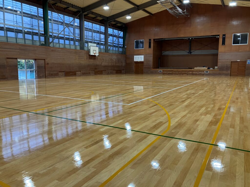 西郷南中学校は昭和62年に建設されており、約38年ぶりに体育館フロアが更新され、素敵なフロアになりました。