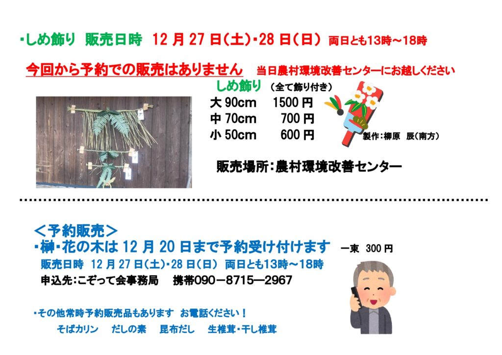 五箇支所地域振興係 閲覧数 134 暮のこぞって市の開催について 12/20(土) 2025.12.17 島内 暮のこぞって市を開催します! 農林水産物など多数取り揃えておりますので、 皆様お誘いあわせのうえお越しください! ●開催日時 令和7年12月20日(土) 午後2時~3時迄 ●会場 隠岐の島町農村環境改善センター ●内容 農産物 新米コシヒカリ、新米もち米、各種野菜など 海産物 石だこ、冷凍白イカ、アオリイカ一夜干し、レンコ鯛一夜干しなど 特売品 だしの素、歯舞昆布、そばかりん、岩のりほか 予約販売 あわび、さざえ ※しめ飾りの予約販売はしておりません。 コメントを残す コメントをキャンセルコメントを投稿するにはログインしてください。