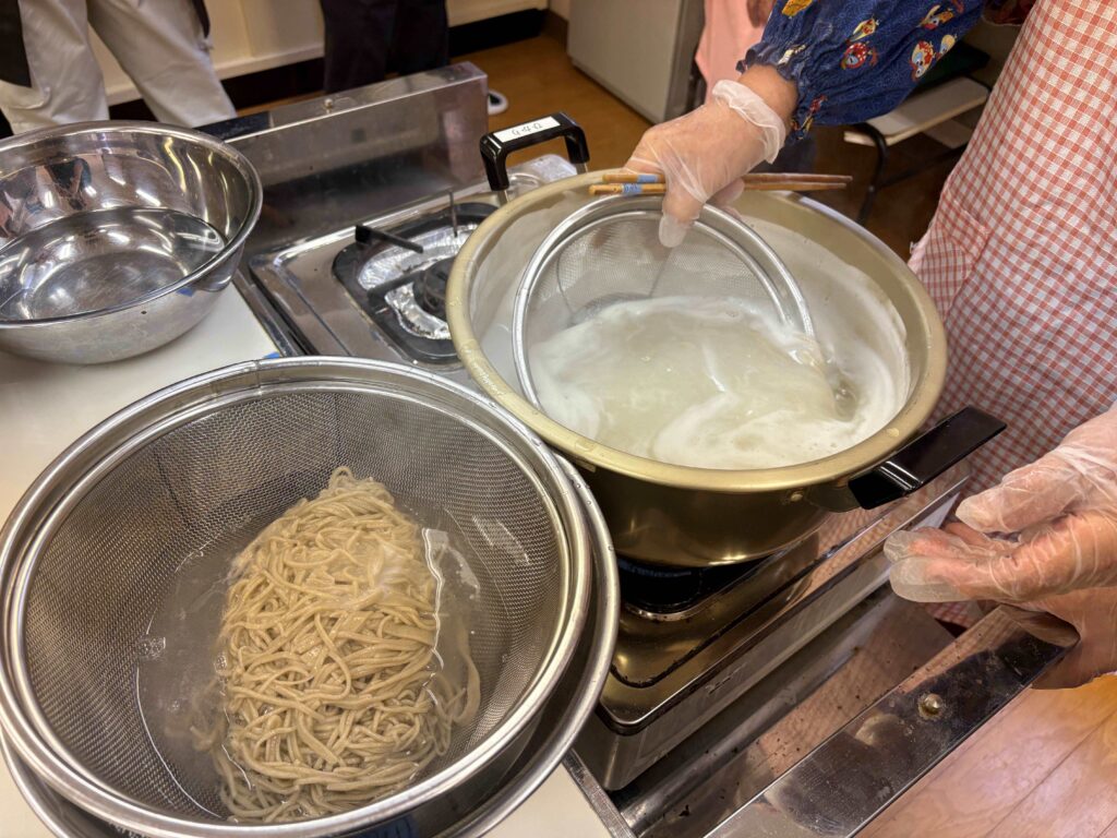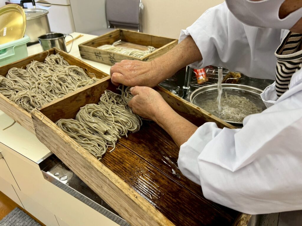 切り終わったら、いよいよ茹での工程です。沸騰したお湯をそばに入れ、再度沸騰してきたらすくい上げて水でよく洗います。こうすることでコシが出て、よりおいしいそばになると教えていただきました。