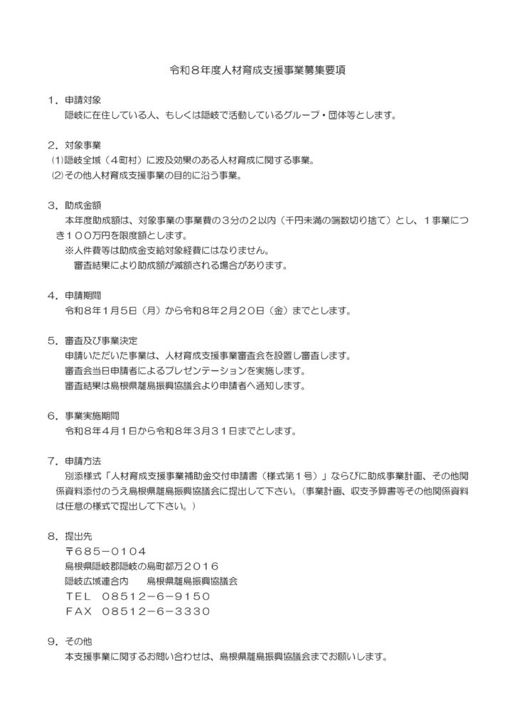 町内で活動されている皆さんの中に、「こんな人材を育てたい」「こんな活動で地域を元気にしたい」といった想いをお持ちの方はいらっしゃいませんか?そんな想いを形にする一歩として、現在「令和8年度人材育成支援事業」の申請を受け付けています。隠岐全域に広がる人づくりを応援する本事業、その概要をご紹介します。