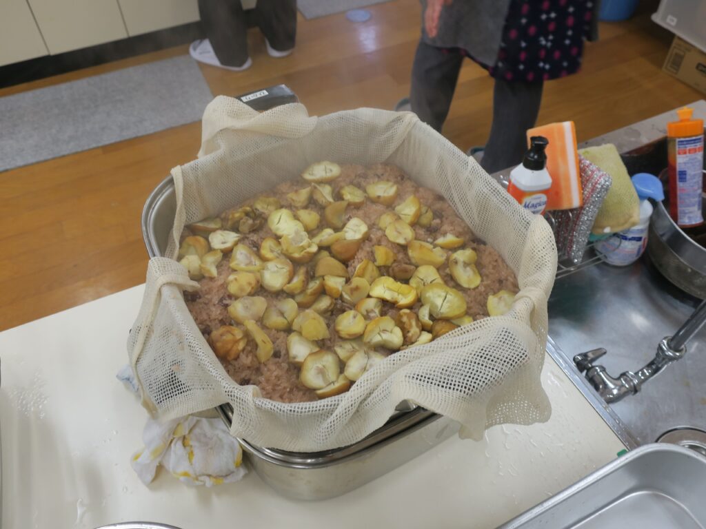 そば作りと並行して、豚汁、赤飯のおにぎり、あんころ餅の準備も進みます。