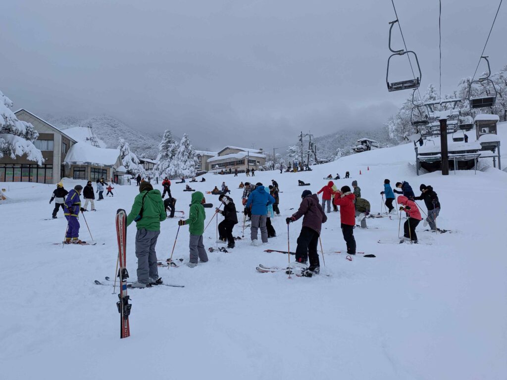 初日は、大山青年の家でスキーの基礎練習やそり遊びを楽しみ、二日目は大山スキー場で一日中スキーに取り組みました。