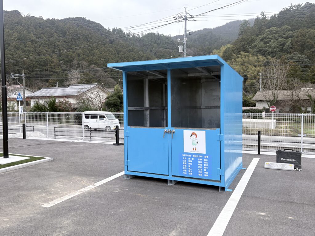 中村地区の中出張所駐車場で令和8年2月26日に段ボール拠点回収設備の贈呈式を行いました。