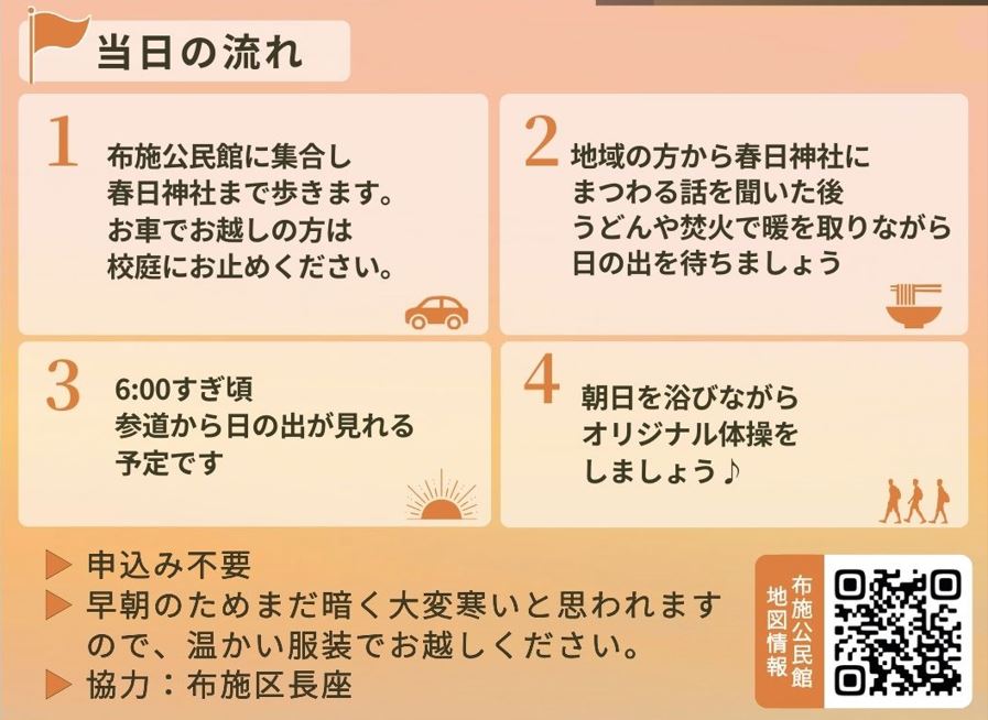 🔶内 容:春日神社にまつわるお話を聞き、日の出を見た後、オリジナル体操を